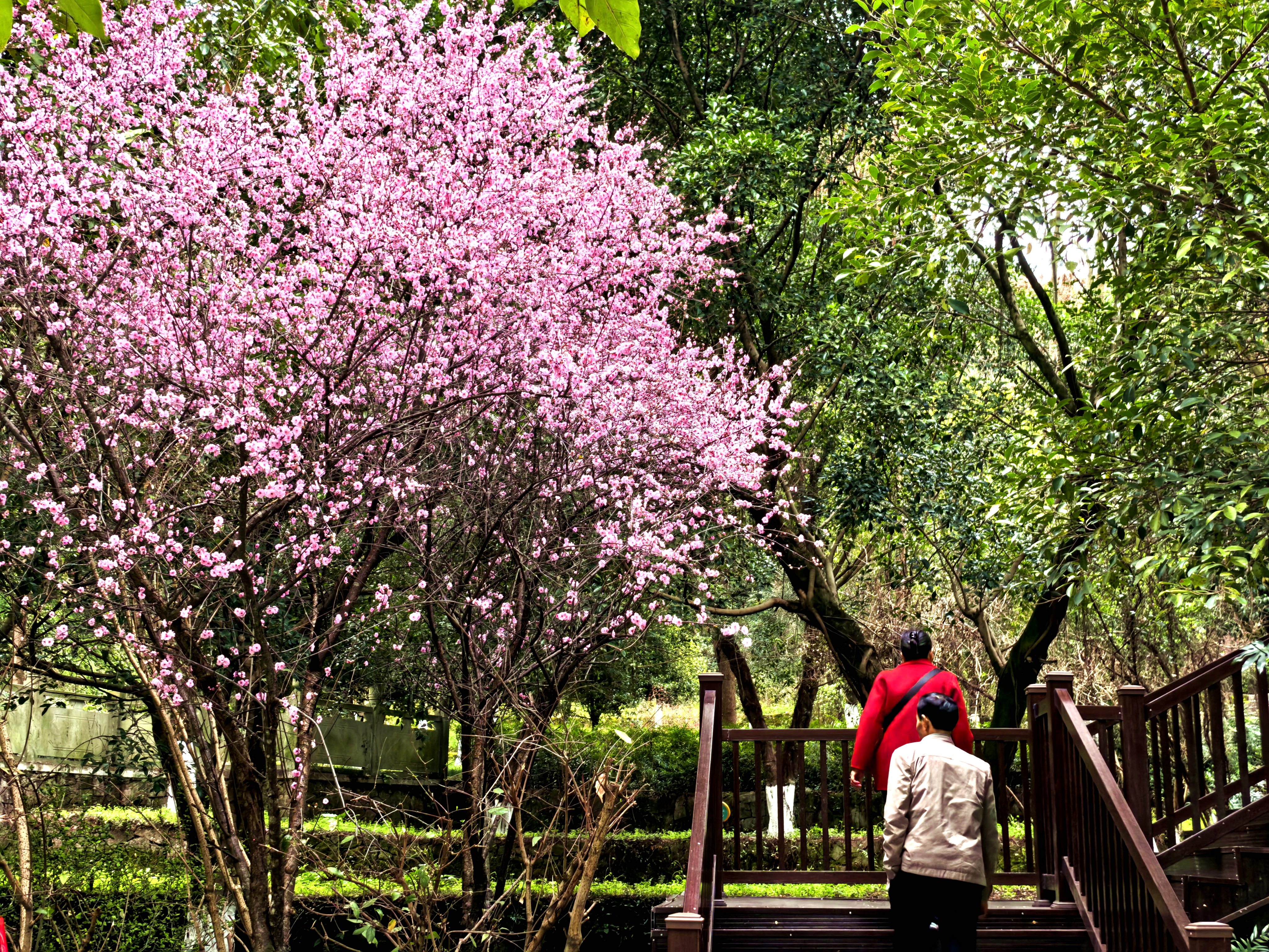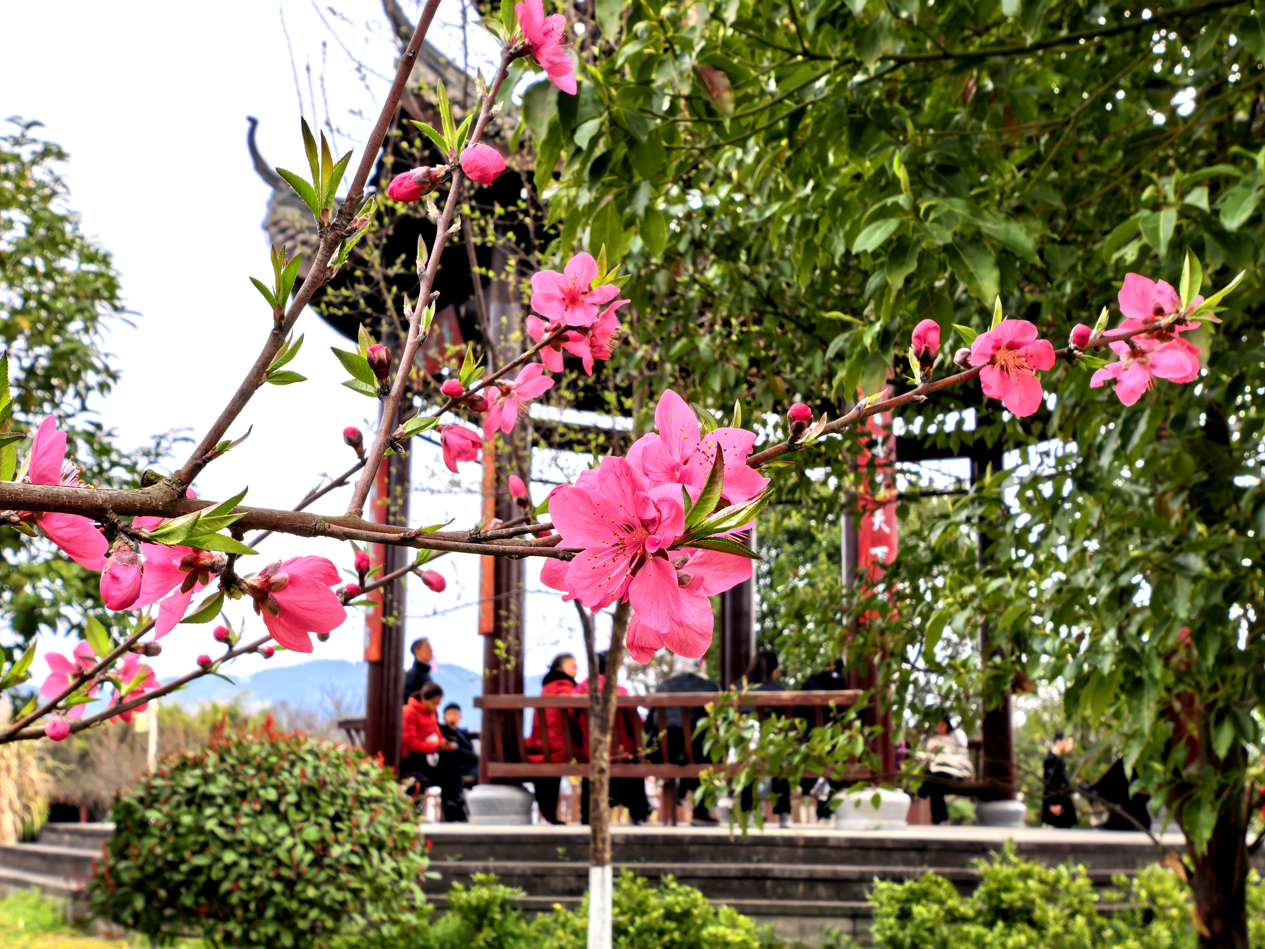 小憩的市民和绽放的桃花意思横生。曾业 摄