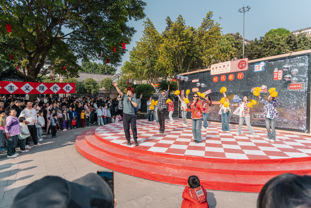 春节本事,走进太平古镇,处处欢歌笑语,怀旧主题行径精彩纷呈。胪列馆广场上,港风师法秀惊艳亮相,川巨变脸绝技引得阵阵惊呼;李家绣楼里,维执婚恋现场复刻狂妄时光;一旁的“嗦面大赛”热气腾腾,尽显东说念主间人烟气。五路“财神”巡游送福,维执舞队穿梭古巷,锣饱读声与称心声在赤水河边震荡,将新春喜庆氛围推向热潮。